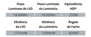 • Vida útil para o LED ≥ 50.000h com baixa depreciação luminosa, conforme certificação L70 e para o equipamento auxiliar 50.000h;