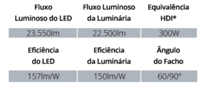 • Vida útil para o LED ≥ 50.000h com baixa depreciação luminosa, conforme certificação L70 e para o equipamento auxiliar 50.000h;
