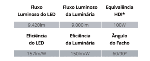 • Vida útil para o LED ≥ 50.000h com baixa depreciação luminosa, conforme certificação L70 e para o equipamento auxiliar 50.000h;