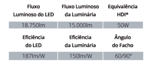 • Vida útil para o LED ≥ 50.000h com baixa depreciação luminosa, conforme certificação L70 e para o equipamento auxiliar 50.000h;