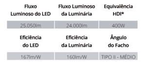 • Vida útil para o LED ≥ 50.000h com baixa depreciação luminosa, conforme certificação L70 e para o equipamento auxiliar 50.000h;