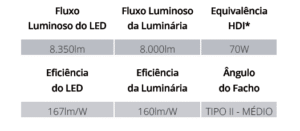 • Vida útil para o LED ≥ 50.000h com baixa depreciação luminosa, conforme certificação L70 e para o equipamento auxiliar 50.000h;