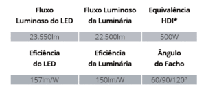 • Vida útil para o LED ≥ 50.000h com baixa depreciação luminosa, conforme certificação L70 e para o equipamento auxiliar 50.000h;