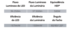 • Vida útil para o LED ≥ 50.000h com baixa depreciação luminosa, conforme certificação L70 e para o equipamento auxiliar 50.000h;
